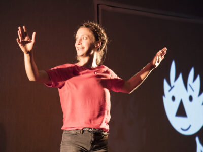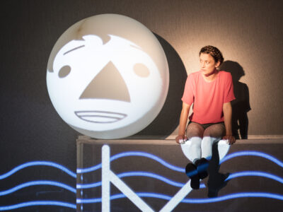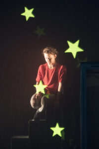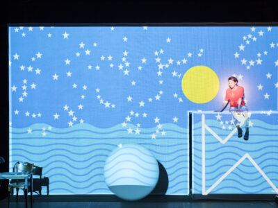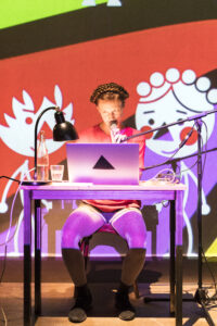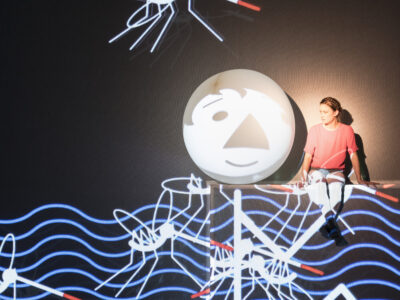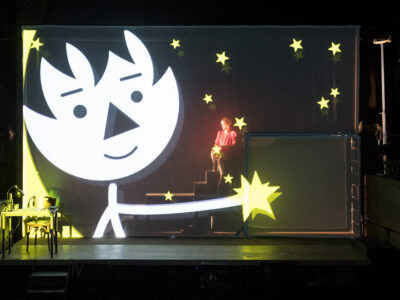 Unter Anleihe von ihren literarischen Aszendenten Romeo und Julia verguckt sich Humania, die Filmstimme von Animeo, in den animierten Mitstreiter auf der Leinwand. Eine Kamera filmt die Bewegungen der Schauspielerin und überträgt sie auf die digitalen Figuren; Körper und Bild umgarnen sich. Theater kommt nicht ohne physische Präsenz der Schauspieler*innen in Echtzeit aus. Animation dagegen ist ein langsamer technischer Prozess, der im Studio stattfindet. «Animeo & Humania» arbeitet sich an dieser Mediendiskrepanz ab und experimentiert mit Liveness und Technik.