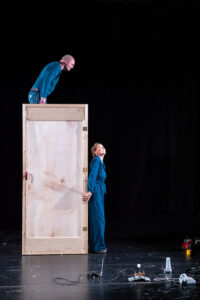 Auf der Bühne steht eine grosse Kiste: Ist das eine riesige Verpackung, eine Tele-fonkabine, eine Werkstatt, ein Aufzug, oder gar ein Raumschiff …? Straßenlaternen wachsen aus der Kiste heraus. Ein winziger Dirigent schiebt sich über die Bühne und gibt den Takt an. Alles hat ein Eigenleben und beginnt miteinander zu spielen: das Licht, die Musik, die Menschen und die Objekte. Ausgefallene und absurde Spielideen, Sound und Rhythmus bringen die Dinge zum Tanzen. Das Stück eröffnet einen eigenwilligen Bühnenkosmos, der zum Schmunzeln und Staunen anregt und den gewohnten Blick auf die Dinge hinterfragt.