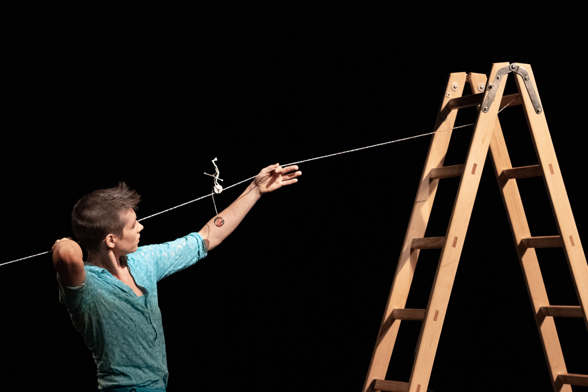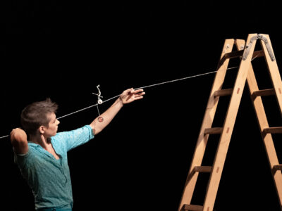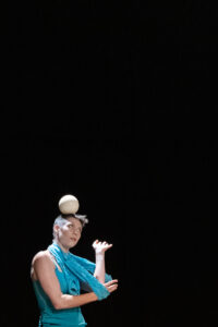 Ein leichtfüssiges Spiel mit allem, was auf der Bühne zu finden ist: Mit Ball, Leiter, Seil, Packpapier und einem Overall. Eine Kristallkugel öffnet das Universum: Und dann tanzt der wundersam zum Leben erwachte Overall mit und ein Papiermonster frisst das Seil auf. Der Ball rollt über Kopf, Nacken und Arme der Jongleurin und wird in allen erdenklichen Lagen in Balance gehalten. Elegant fliesst Bodenakrobatik mit ein, und plötzlich geht es ganz eindeutig und handfest um das Gleichgewicht. Eine wunderbare, unprätentiöse Leichtigkeit liegt über allem. Manchmal blitzt ein bisschen Wehmut durch …