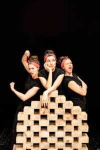 Drei Frauen spielen ein kabarettistisches Stück über Sisyphos und den bürokratischen Wahnsinn mit Sprache, Rhythmus und Bewegung.